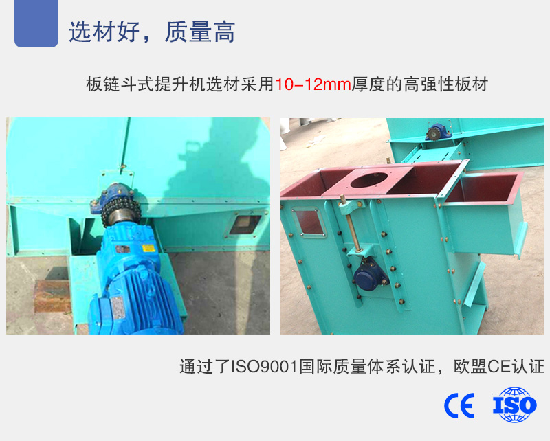 設(shè)備質(zhì)量的好壞直接影響其工作效率,板鏈斗式提升機(jī)選材采用10-12mm厚度的高強(qiáng)性板材,產(chǎn)品不合格不出廠,我們生產(chǎn)的板鏈斗式提升機(jī)通過(guò)了ISO9001國(guó)際質(zhì)量體系認(rèn)證,歐盟CE認(rèn)證,廠家承諾如果我們的產(chǎn)品在售出后30天出現(xiàn)問(wèn)題可以免費(fèi)退換。