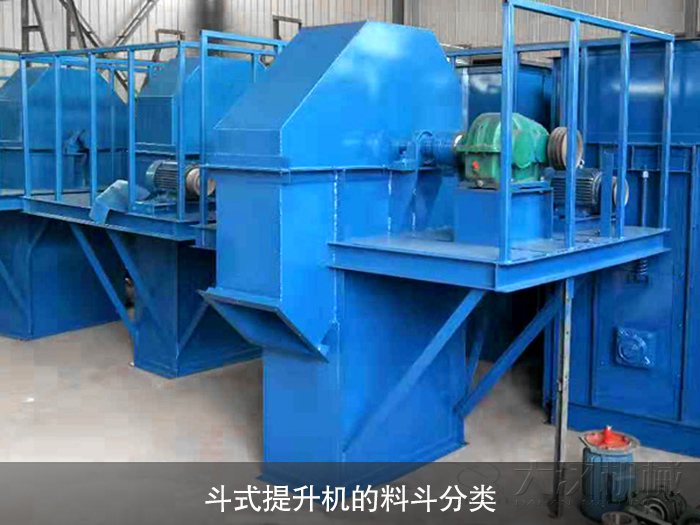 斗式提升機分為深斗、淺斗和三角斗。根據斗式提升機的工作速度和被運物料特性的不同,可采用不同的不同的料斗形式。深斗的斗中與料斗后壁夾角大,每個料斗可裝載較多的物料,但較難卸空,適用于運送干燥的松散物料;淺斗的斗中與料斗后壁的夾角小,每個料斗的裝載量小,但容易卸空,適于運送潮濕的和粘性的物料。深和淺斗在斗式提升及沿牽引構件長度方向間隔一定距離地固定在牽引構件上。深斗是具有導向側邊的三角形料斗,這種料斗在提升機中采用一個接一個的密集布置,當繞過上鏈輪卸料時,前一個料斗的兩導向側邊和前壁形成后一個料斗的卸載導槽,這種料斗適于輸送較重的、半磨琢性的、磨琢性大的塊狀物料。
