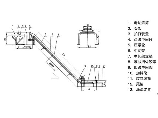 (1)、大傾角皮帶輸送機為一般用途的散狀物料連續輸送設備,但采用的是具有波狀擋邊和橫隔板的輸送帶。因此,特別適用于大傾角及垂直90°輸送。